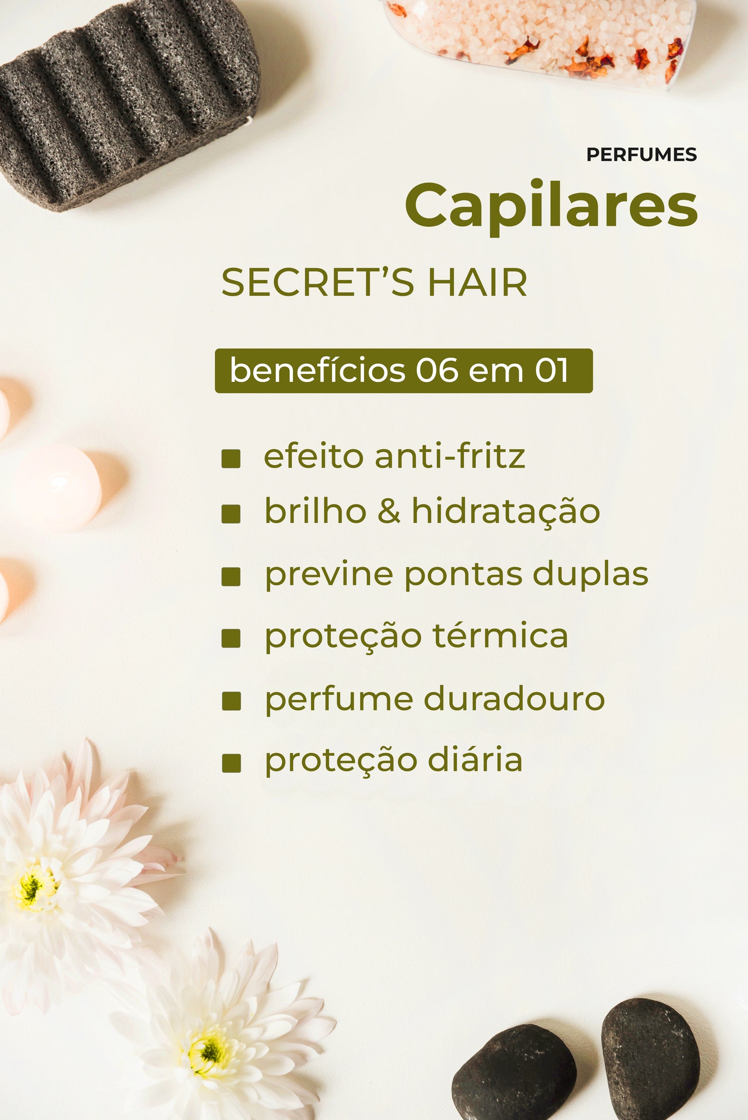 Nosso perfume capilar 6 em 1 foi desenvolvido para quem deseja cabelos perfumados, protegidos e hidratados. Com tecnologia exclusiva, ele combate os 6 principais problemas capilares: